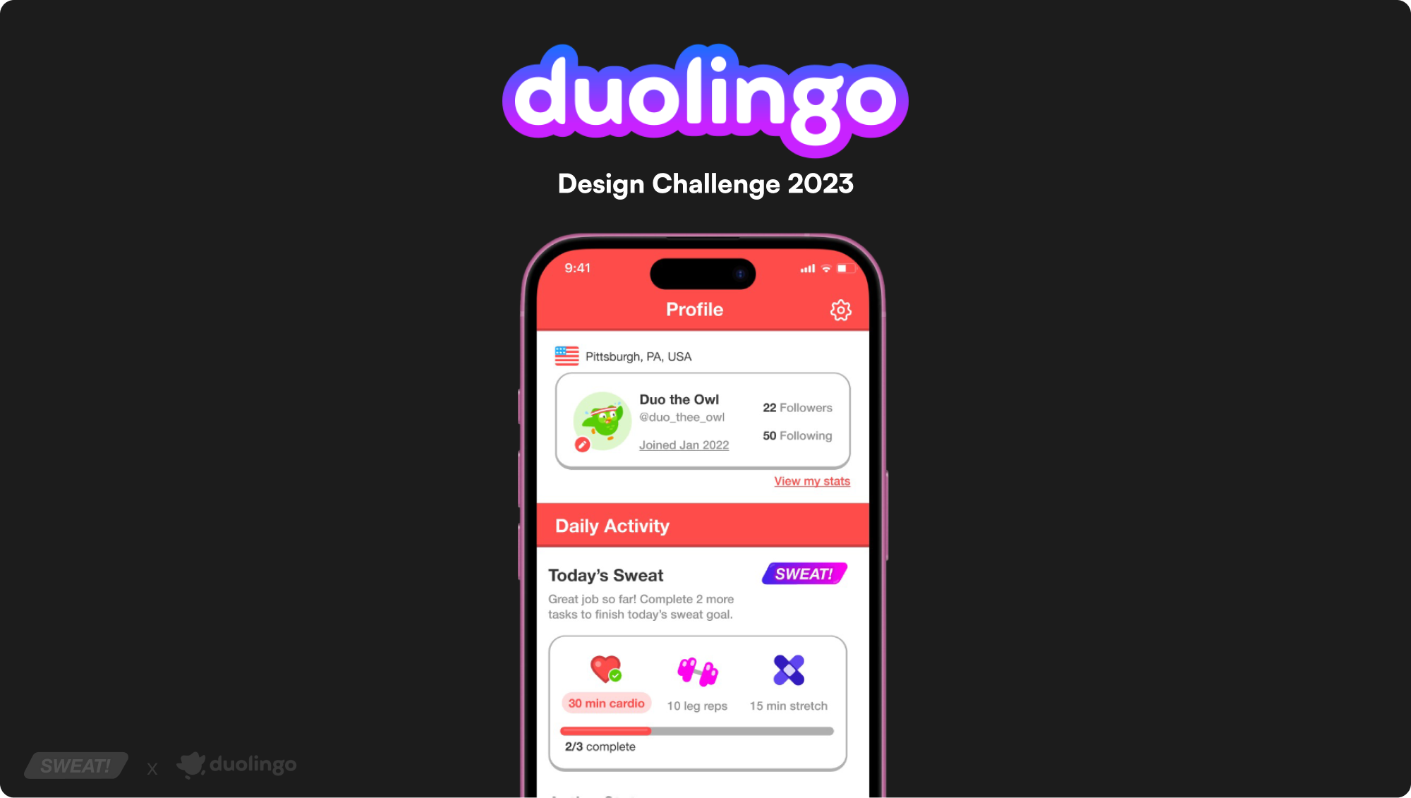 Mobile app UI to help motivate Duo the Owl to sweat