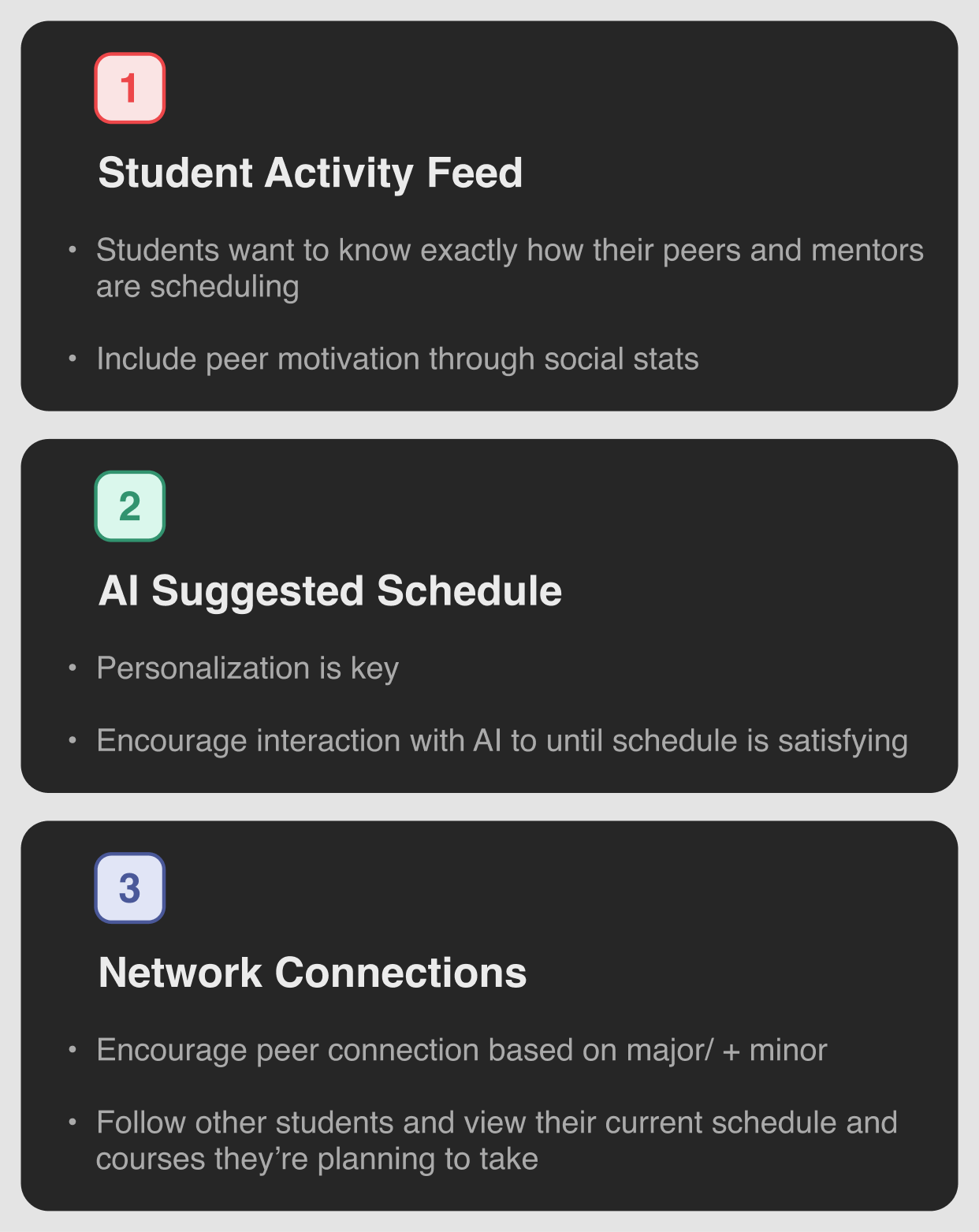 This allowed me to translate the following user pain-point themes into features students actually want to use.
